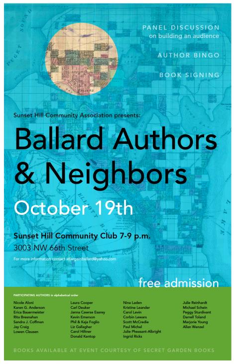 You are invited to a one-of-a-kind event on October 19: Ballard Authors & Neighbors. For the locals reading this post, you know that Ballardites stick together. It has the feel of a small town inside a big city. What has changed since I was a child is that Ballard has become a diverse quilt of art, music, hip shops and restaurants.