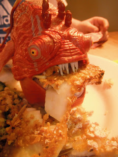 Thankfully, it was only a 2 day flu. My son never got it, and he was the only one to taste the dip. Makes you think. We went on to make the Opee Sea Crunch, the Boonta Breakfast Tarts, and the Darth Malt. We already had the toy in the picture from our favorite toy store – Goodwill. None of them were great recipes from a professional standpoint, but they all put a smile on my kids’ faces.