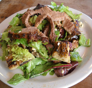 Here is her grilled bread salad topped with brisket and grilled green peppers, tossed in a bleu cheese vinaigrette that just rocked. I had to take a picture. It’s a wonderful way to have your brisket on the light side. It’s not quite “Meatless Monday”, but it’s leaning that way.