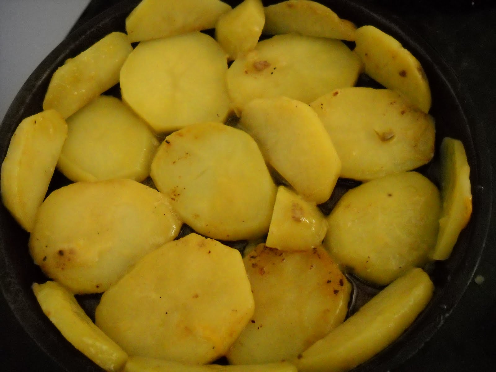 6) Place potatoes in an oiled pan that you don’t mind getting a bit sooty. A 10-inch pie pan works well. Cut some potato slices in half so the “crust” goes up the sides of the pan.