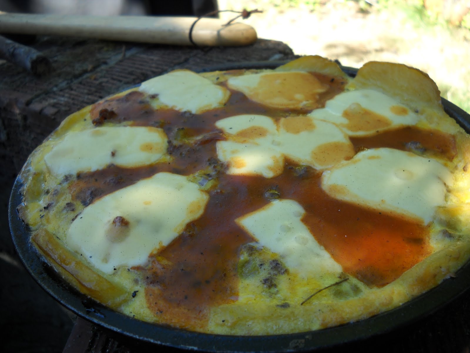 8) Bake for 30-40 minutes. Add slices of Oaxaca cheese in a sun pattern, and alternate stripes of enchilada sauce. Bake for another 20-30 minutes until center doesn’t wiggle.