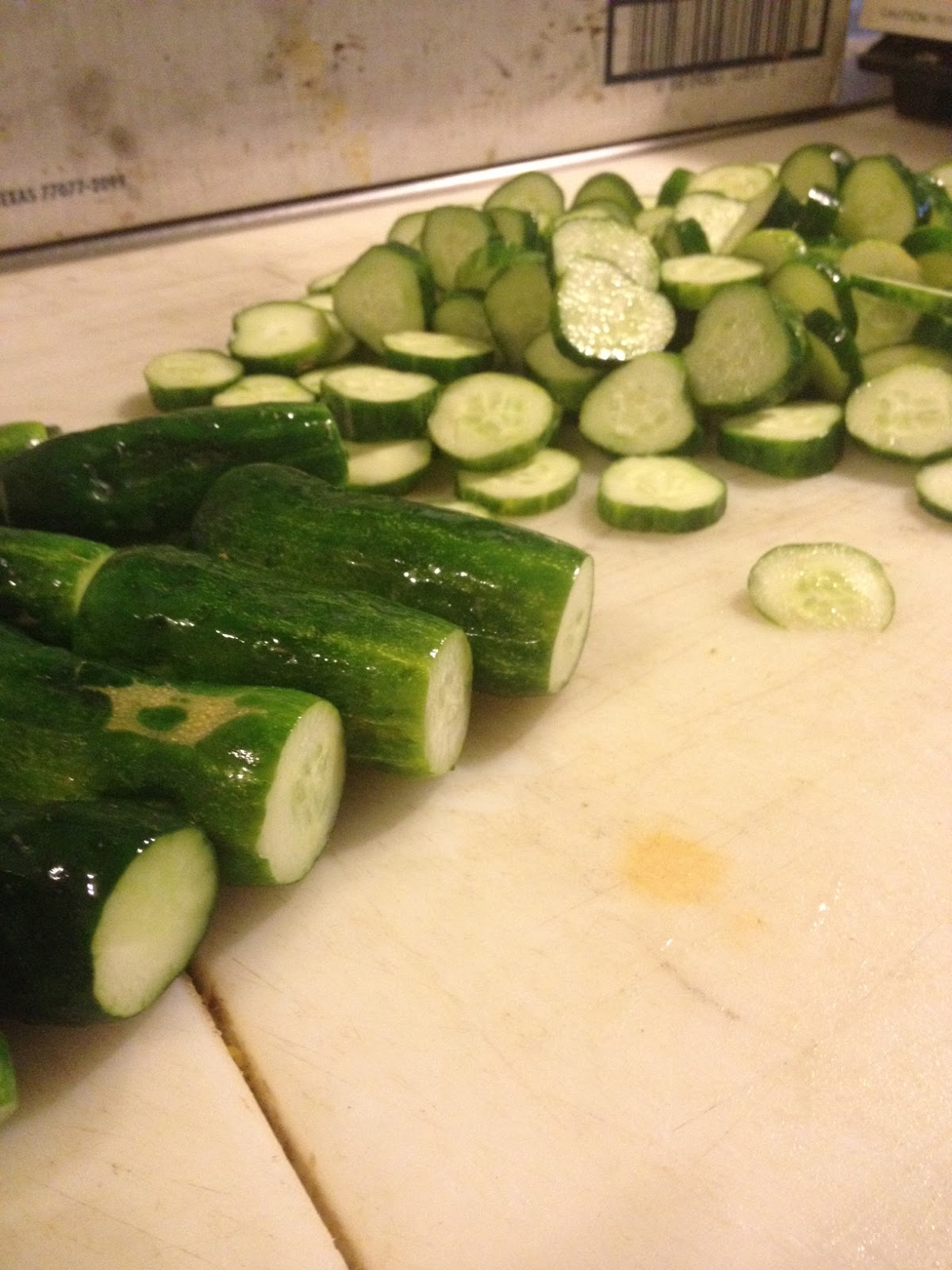 I’ve been experimenting with pickles for the restaurant. We serve them on the small plates and with sandwiches. This new batch is very garlicky and spicy. I think in a good way. It’s too early to tell. I’ve made a large batch of refrigerator pickles – hopefully a one month supply – and will can some of the batch tomorrow.