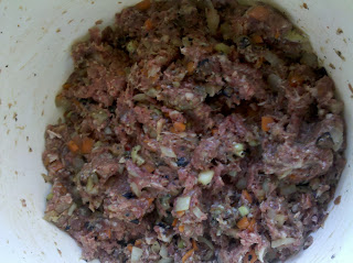 That inspired me to create something really good using what I had on hand in the refrigerator. I had 2 carrots, 3 mushrooms, 2 stalks of celery, half an onion, a hard end of bread, half a package of bacon, and some ground beef in the freezer. All I needed was some pork sausage and I had everything I needed for meatloaf.