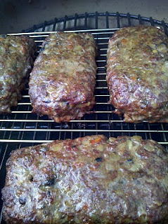 6. Place entire rack with loaves on an indirect grill with a drip pan underneath. Smoke meatloaves for 2 hours, or until internal temperature reaches 160. For a faster cook, 300 degrees at 1.5 hours.