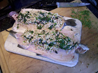 The very first night, within an hour of unloading my new Big Green Egg, I fired it up. Eric had bought some wonderful looking Rainbow Trout, and we decided to smoke-roast it on the Egg as a christening.