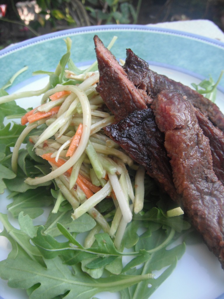 Grill the ribs on high heat, 2 minutes per side approximately, then let the meat rest while you make the salad. The beef came out tender, with a light sweetness from the marinade and, most importantly, not overly salty. So often commercial rubs and marinates are loaded with salt, but these came out nicely balanced.