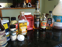 My sauce didn’t have anything too scary. I included the certain ingredients: ketchup, mustard, apple cider vinegar, Worcestershire sauce, garlic and salt, then added the bits and ends in my fridge to make the sauce. I had some bourbon, old ginger, and the end of a bottle of maple syrup to throw in. It made a rich, dark sauce. Here is a picture of my ingredients:
